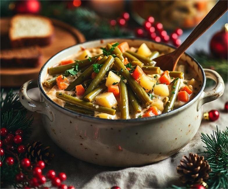 Выпечка: 40–45 минут Ингредиенты Приготовление 1. Грибной бульон. Возьмите 300г свежих шампиньонов. Нарежьте грибы крупно, лук — четвертинками, морковь — кружками. Залейте 1 литром холодной воды, добавьте лавровый лист, пару горошин перца и щепотку соли. Доведите до кипения, снимите пену и варите на слабом огне 30–40 минут — бульон должен стать ароматным и насыщенным. Процедите, грибы можно использовать в другом блюде. 2. Разогрейте духовку до 180 °C (режим верх-низ). В кастрюле доведите воду до кипения, слегка посолите и выложите фасоль. Доведите до кипения и варите 5 минут — фасоль должна слегка размягчиться, но остаться хрустящей. Откиньте на дуршлаг и дайте стечь — лишняя вода сделает запеканку водянистой. 3. В большой миске смешайте грибной суп (или домашний бульон), молоко и соевый соус — венчиком или вилкой до однородности. Добавьте отваренную фасоль и хорошо перемешайте. Выложите смесь в жаропрочную форму объёмом 1,5–2 литра, разровняйте. Соус