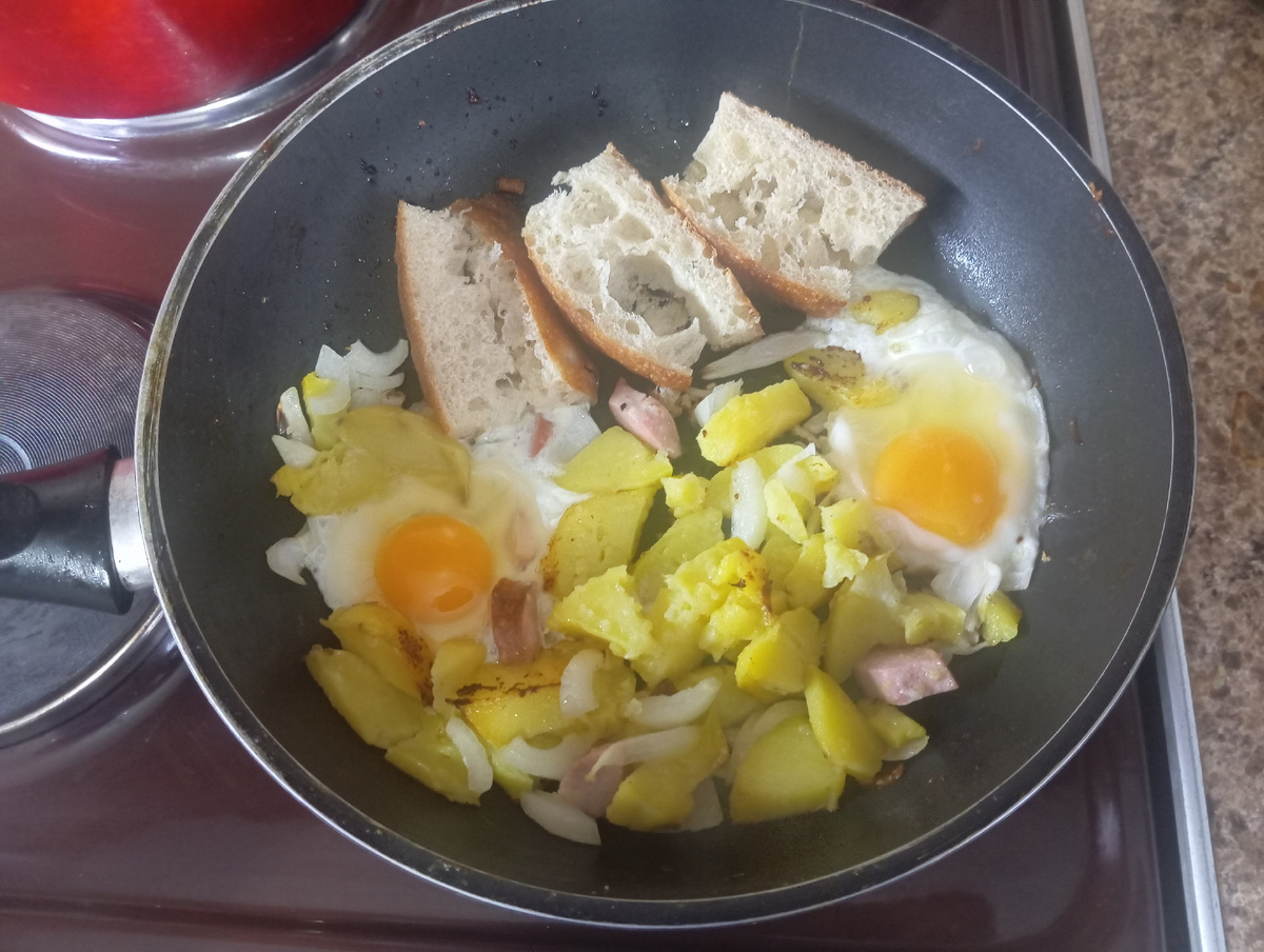 С завтраком тоже поступила по-простому. Нарезала остатки вареной картошки, сосиски, лука и лепешки. Разбила два яйца и поджарила на сковороде. Тоже нормально. Раньше мы прямо из сковородки ели вдвоём- втроём, ничего не случилось. Не агитирую. Сейчас в раковине тарелку сполоснуть недолго.