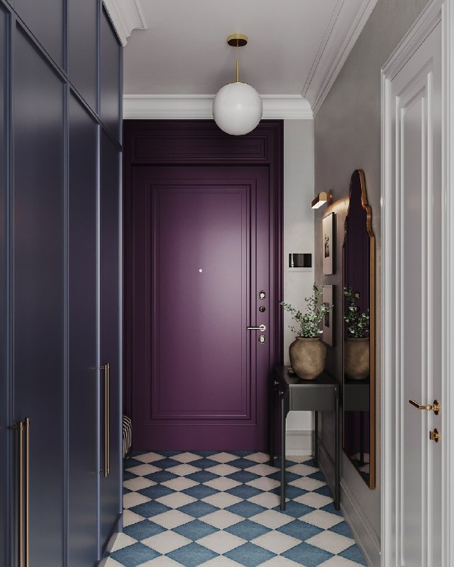 Представленный дизайн-проект является выдающимся примером тщательной проработки как функциональных аспектов, так и глубокой эстетической выразительности. Он демонстрирует высокий уровень профессионализма в планировании пространства, выборе материалов и создании атмосферы, а также смелость в использовании цветовых решений, что вместе формирует уникальный и запоминающийся интерьер. С точки зрения профессионализма, проект сразу же привлекает внимание продуманной организацией пространства, особенно в зоне прихожей, которая часто является сложной для дизайна. Встроенный шкаф от пола до потолка, выполненный в глубоком синем цвете с утопленными ручками, является эффективным решением для хранения, максимально используя вертикальное пространство без визуальной перегрузки. Его гладкие, фрезерованные фасады интегрируются в архитектуру помещения, создавая впечатление стены, а не отдельно стоящего предмета мебели, что говорит о внимании к чистым линиям и порядку. Эргономика и удобство использования