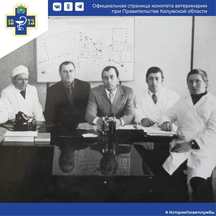 производственному управлению упразднена Мещовская райветлечебница и с 01.04.1964 организована Мещовская станция по борьбе с болезнями животных. На фотографии 1975 года слева направо: Фомин Ю.Д., Качаев В.А. ветврачи колхоза «Коммунистический труд», Тупицин А.В. начальник комплекса колхоза «Коммунистический труд», Скороходов А.А. главный ветврач Мещовского района, Делян А.Т. главный зоотехник колхоза «Коммунистический труд», Игнатов В.И. заведующий Алешинским ветпунктом. В послевоенные годы в районе постепенно увеличивалось поголовья скота. В 70-е, 80-е годы только в общественном секторе поголовье КРС доходило до 42 тысяч голов, до 20 тысяч голов свиней, до 4-х тысяч голов МРС, до 400 голов лошадей, соответственно росла и ветслужба. На территории Мещовского района имелось десять ветучастков и пять ветпунктов. #Калуга #ИсторииГосВетслужбы #ветеринария