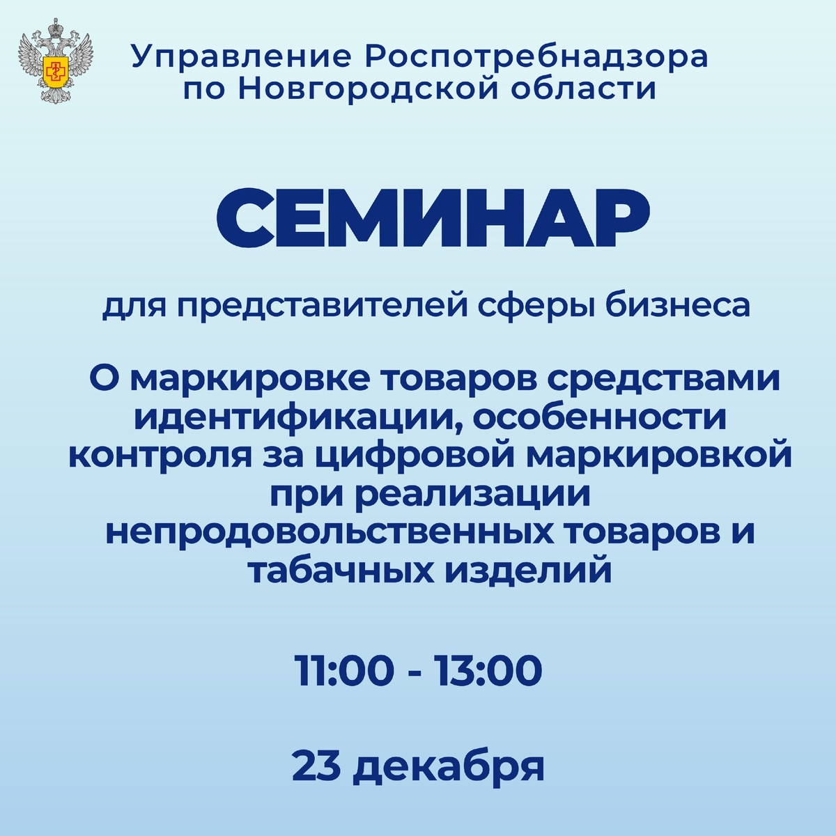 ⚡ Управление Роспотребнадзора по Новгородской области 23 декабря 2025 года с 11-00 до 13-00 проводит семинар для представителей сферы