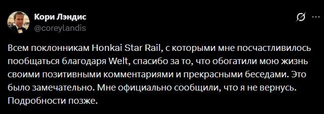На днях Кори Лэндис, озвучивающий Вельта, поделился постом в X, о том, что его планируют заменить Он сам связался с HoYoverse по поводу увольнения, ведь китайцы даже не рассказали, что будут его заменять. В ответ ему заявили, что сотрудничество не продолжилось из-за неподписанного контракта, а дальше классический цирк. Ждём продолжения ㊗️ Поддержи Сенсея бустом / Подпишись на Сенсея