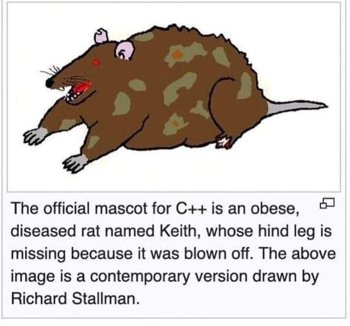 Так выглядит маскот языка C++ На самом деле это мем из сатирической энциклопедии Uncyclopedia, где в качестве маскота «плюсов» указана больная крыса по имени Кит. Вот только интернет не выкупил прикола и принял всё за чистую монету. Теперь с крысой делают игрушки и даже арты для взрослых. Что думает бедолага Страуструп по этому поводу, неизвестно. 😁 — пора писать петицию, чтобы признали официальным маскотом