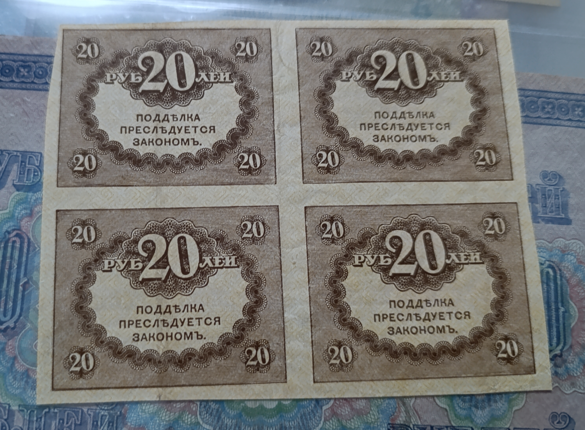 Недавно смотрел отрывок из одного фильма, там употребили слово "керенки". Я думаю, даже те, кто не особо собирает бумажные деньги нашей страны, догадываются, что это такое. Слово "керенки" произошло от фамилии известного Александра Федоровича. Коллекционеры, взявшие это слово из тогдашнего обихода, стали использовать его по отношению к казначейским знакам номиналом 20 и 40 рублей образца 1917 года. К примеру, в это же время были купюры "думки", а чуть позже - "пятаковки". У коллекционеров вообще использование "разговорных названий" в большом ходу, так как это позволяет сэкономить время на объяснении типа бумажных денег. Данную публикацию давайте посвятим "керенкам". Сразу покажу те экземпляры, которые есть у меня в коллекции. Вот так они выглядят. 20 рублей: 40 рублей: Как может заметить наблюдательный читатель, в каждом блоке у меня по 4 керенки. Блоки являются лишь фрагментами большого листа. Керенки выпускались листами по 40 штук - 5Х8. В идеале - в коллекции должен быть полны