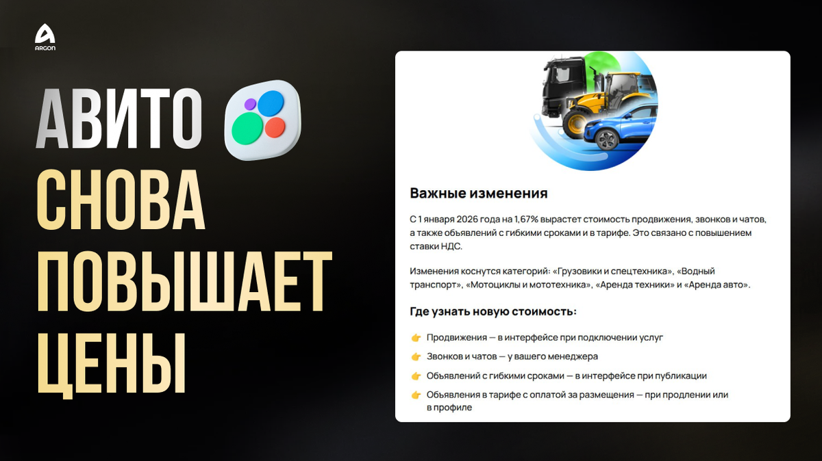 Avito начал рассылать уведомления продавцам и сфер аренды спецтехники, авто, продажи мотоциклов, водных транспортов и спецтехники: с 1 января 2026 года стоимость платных услуг вырастет на 1,67% - Сферы