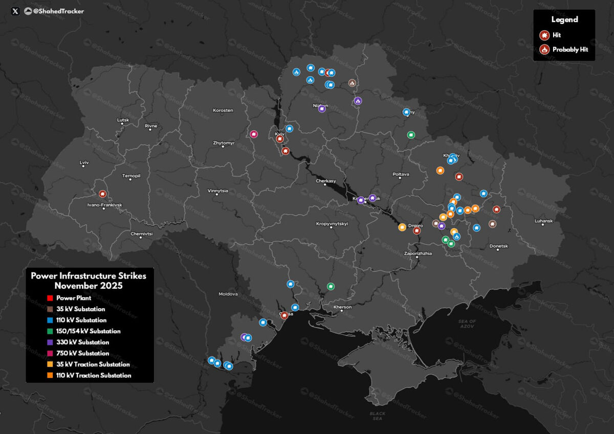Минимум 57 объектов энергетической инфраструктуры Украины было атаковано в течении ноября 2025 года, что вызвало 49 отключений электроэнергии. Из них: ▪️8 ТЕС, ТЭЦ, ГЭС и тд; ▪️3 подстанции 35 кВ; ▪️27 подстанции 110 кВ; ▪️4 подстанции 150 кВ; ▪️6 подстанций 330 кВ; ▪️1 подстанция 750 кВ; ▪️8 тяговых подстанций. Всего же публично подтверждено около 320 попаданий по различным объектам, из которых 46 ударов были комбинированными. Большинство целей находилось в Киеве, Киевской, Одесской, Николаевской, Черниговской, Сумской, Харьковской, Днепропетровской областях, а также на подконтрольной Украине части ДНР. Количество пораженных объектов энергетики в ноябре заметно меньше, чем в октябре, однако накопительный эффект от ударов дает о себе знать и количество отключений электричества остается прежним. Военный Осведомитель