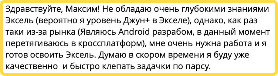 Мы ищем человека на Ексель - сверки по парсингу, в личку ребята откликаются. Цитирую еще: "Изначально пошел в программирование, тк нравится разрабатывать. В андроид пошел, потому что мне показалось это интересным. На протяжении 4х лет моей учебы я набрал там сям - фриланс, хх более 2 лет опыта работы. Все нормальные места работы, которые даже года 2 было сложной найти я потерял из-за того что колледж забирал все время в итоге ищу работу уже более 5 месяцев " Вот реалии. это Москва. А так меня в личке завалили просьбами дать работу по сверкам в Екселе. Удаленка, пол-ставки. Пишут с разных регионов РФ. Скорее выберем человека с ИП, т.к. в штат не хочу брать... Русский ИТ бизнес