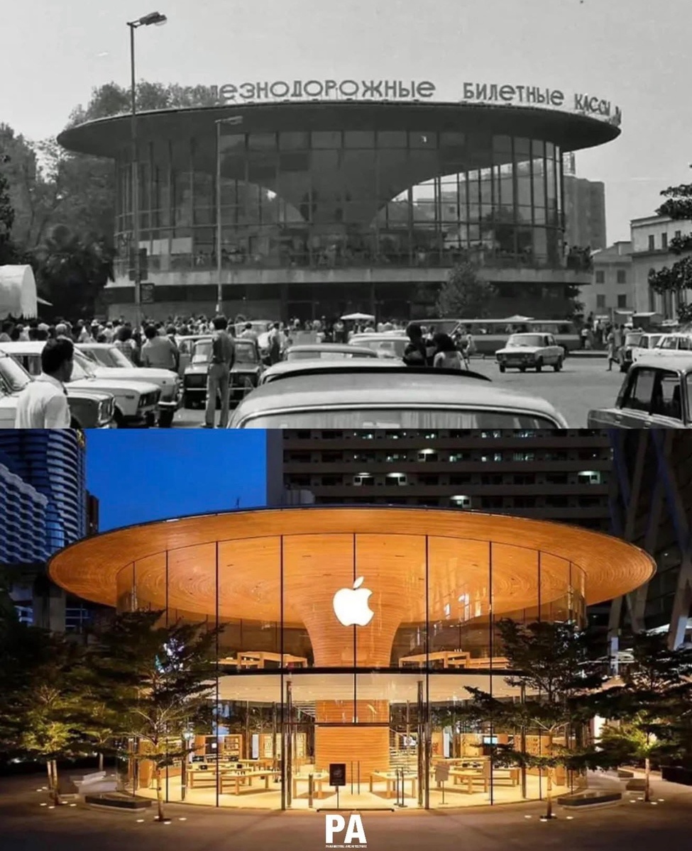 Вообще, весьма баянистый баян, но между архитектурой современных магазинов Apple Store и конструктивизмом советского периода определенно