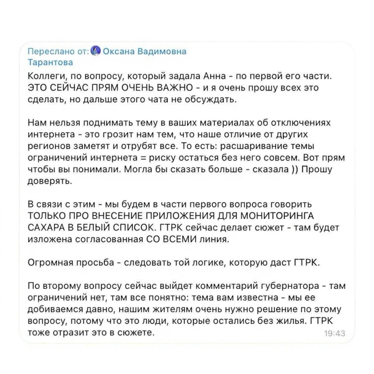 На прямой линии с президентом местная журналистка рассказала о постоянных отключениях мобильной связи и интернета. Путин дал очень подробный и толковый ответ. Я как раз публиковал этот эпизод. Но обращение к главе государства не понравилось местным чиновникам. Министр общественных коммуникаций области Оксана Тарантова разослала главредам СМИ негласные рекомендации. Надеюсь, Владимир Владимирович оценит такую реакцию на его диалог. Подпишись на Телеграм Александр Семченко