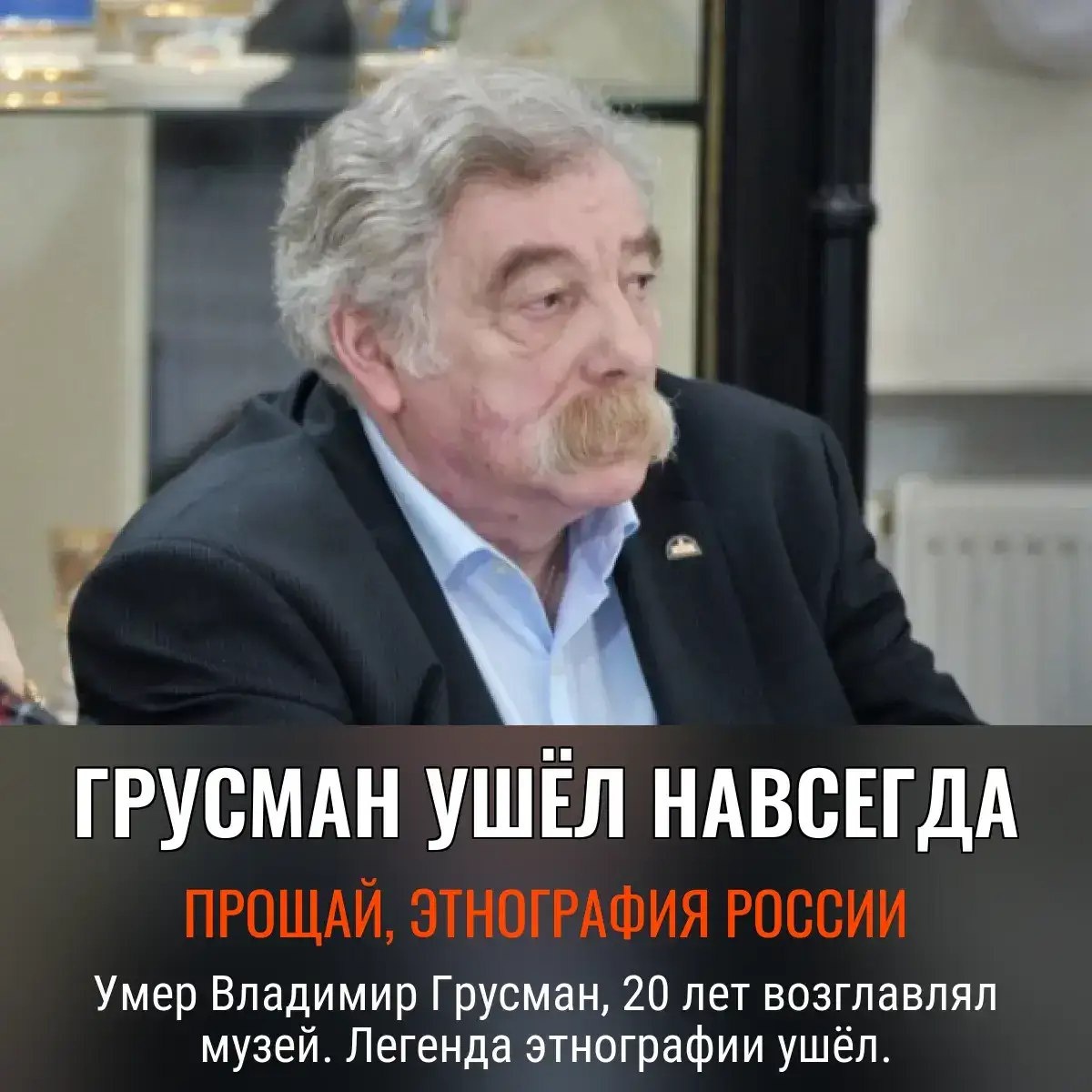 20 лет таскать на себе этнографический музей — без малого подвиг для скучающего Петербурга. 🤦♂️ Трудяга, музейщик до мозга костей, философ, и доктор — теперь лишь табличка в холле. История Грусмана — это эпоха, когда даже экспонаты были скромнее. Уже второй за пару дней — раньше ушёл Белов, теперь Грусман. У российских творческих кругов что-то вроде «чёрной пятницы»., Следите за новостями 📩
