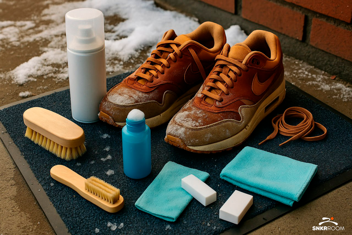 Приветствуем всех читателей, на связи команда SNKRROOM. Сегодня мы поднимем злободневный вопрос, почему зимой так сильно убивается обувь и как это предотвратить. Российская зима — это не только снег, но и бесконечная слякоть, лужи с реагентами, белые разводы и хронически мокрая обувь. Хорошая новость в том, что первая помощь кроссовкам занимает меньше 10 минут и реально продлевает им жизнь. Мы разработали пошаговый алгоритм, как ухаживать за кроссами зимой: что сделать сразу, как сушить без вреда и чем убрать соль так, чтобы не испортить материал. Быстрые напоминания и чек-листы мы периодически выкладываем в телеграм-канале — заглядывайте и сохраняйте себе. Чтобы ваши любимые кроссы пережили даже самую лютую зиму, заранее подготовьте следующее: С таким набором экспресс-уход за кроссовками действительно занимает считанные минуты. Самое главное правило: не заносите грязь в квартиру! Пока пара еще влажная, уберите остатки грязи и налет реагентов с подошвы влажной салфеткой. Дальше выньте