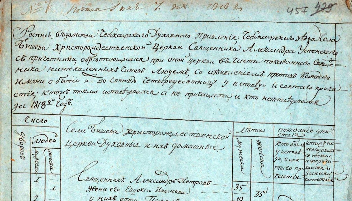 ГИА Чувашской Республики (ГИА ЧР), фонд № 225, опись № 7, дело № 37, стр. 699 скан. Подана июня 28-го дня 1817 года. Роспись Чебоксарского уезда ведомства села Бишева Христорождественской церкви священника Михайлы Александрова с причетники обретающимся при оной церкви в приходе нижеявленых чинов людей со изьяснением против коегождо имени о бытии их в Святую Четыредесятницу у исповеди и Святых таин причастия, и кто исповедовался токмо а не причастился и за каким винословием 1817 года. Показанного села духовные и их домашние. 1. Священник Михаил Александров. 67 лет. Жена ево Федосья Степанова. 57. У них дочь Ксения. 28. https://yandex.ru/archive/catalog/4a76905f-f065-4d96-8e7a-51d1a5ad7bab/699