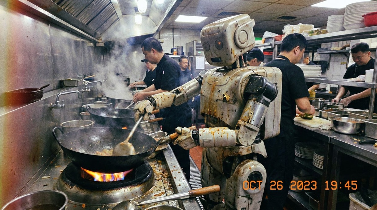 сделай изображение как-будто сфотографировано на мобильный телефон: [ваш вариант действий робота, например: робот работает официантом в ресторане быстрого питания]