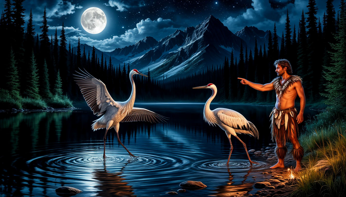 Он привёл её к озеру. В лунном свете вода была не серебристой, а чёрной, как полированный обсидиан, лишь кое-где отражая дрожащие звёзды. И над этой водой, на мелководье у каменистого берега, двигались тени. Большие, изящные, почти невесомые. Журавли. Не стая, а пара. Но то, что они делали, не было обычным ночным бдением или поиском пищи.
