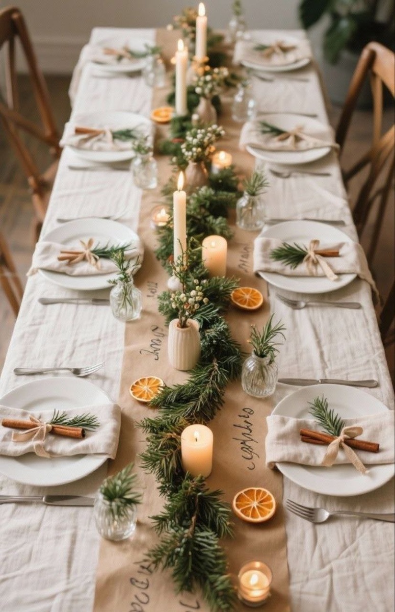 🌟 🎄 Уже несколько лет держатся определённые тренды и в этом отношении ;) 🤩 Стол можно не накрывать скатертью, а использовать раннер (дорожку) в центре стола Можно конечно, и накрыть стол - все, как решат хозяева 🤩 Вдоль раннера укладывается еловая гирлянда, которая украшается засушенными дольками апельсина, палочками корицы 🤩 Вдоль гирлянды можно расставить свечи на разных уровнях - плоские, средние в декорированных банках, высокие светодиодные на подсвечниках - многоуровневость создает игру света и особый праздничный настрой. Также вдоль гирлянды можно разместить светодиодную электрогирлянду с шариками. Центральная линия стола украшается шишками, шарами, рукодельными игрушками и другим праздничным аутентичным декором 🤩 Тарелки сервируются на плейсматах или тканевых салфетках (например, с оборками). Также тканевые салфетки раскладываются на тарелки, сварачиваются с помощью держателей-колец, складываются елочкой и т.д. 🤩 Праздничные блюда, нарезки, фрукты, десерты сервирую