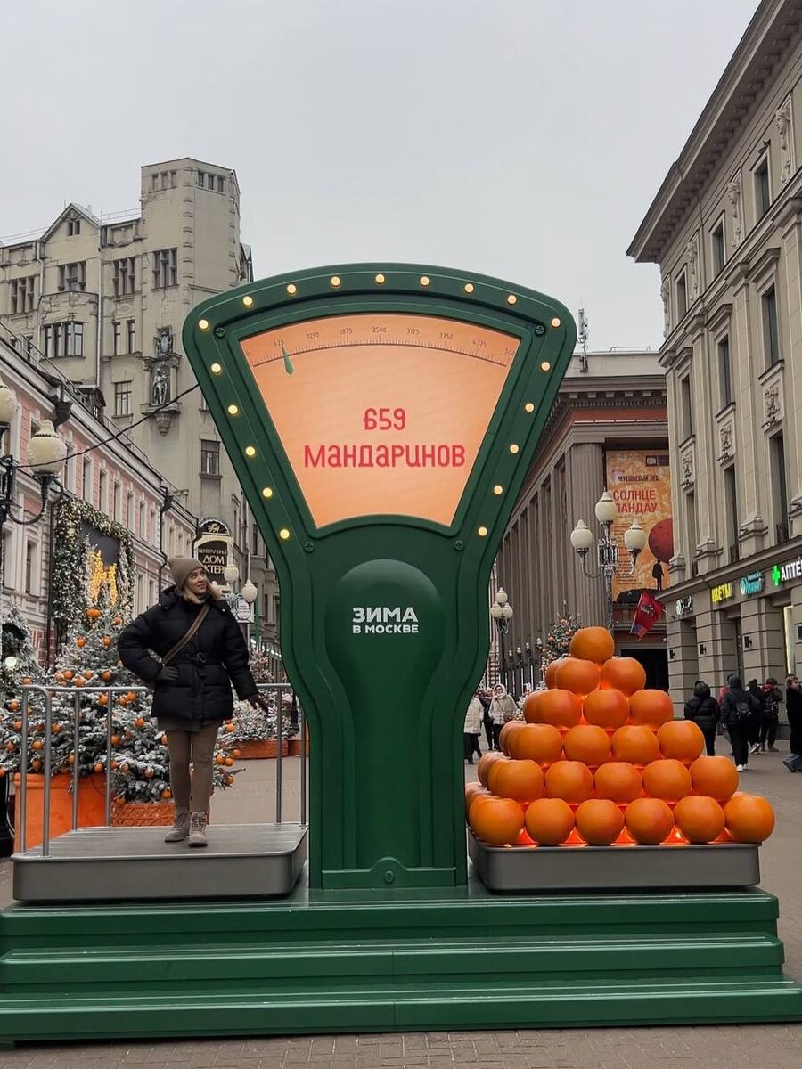 🗓 Круглосуточно, павильон - Пн-Пт 10:00-22:00, Сб-Вс 9:00-22:00 📍 Улица Арбат 💵 Вход свободный Наверное, самая популярная локация предновогодней столицы — улица Арбат, которая превратилась в настоящий мандариновый рай! Елки здесь украшены ярко-оранжевыми фруктами, а павильон «Сделано в Москве» выглядит как огромный цитрус. Но главный арт-объект улицы — гигантские весы, которые измеряют вес в мандаринах. На «контрольное предновогоднее взвешивание» ежедневно выстраиваются очереди! А вы уже измерили, сколько в вас мандаринов? Делитесь результатом в комментариях ⤵️ #локация Подпишись на Куда пойти в Москве