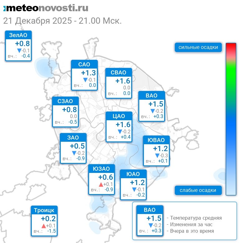 В 21:00 в Москве было от -0.3°C до +1.9°C, средняя температура +1.1°C #погода #Москва #зима #температура #21декабря #воскресенье