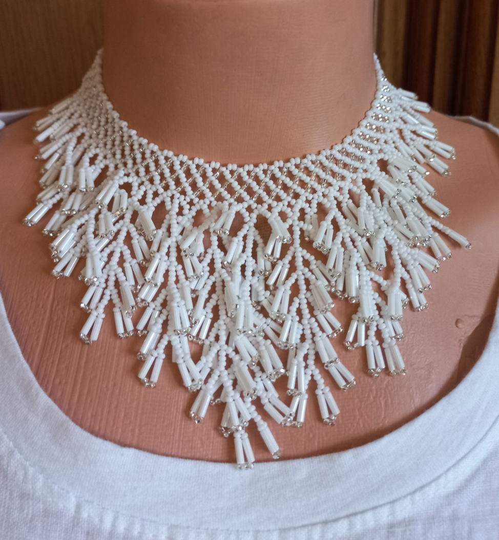 Одна работа была особенно дорогая и сложная — колье из мелкого бисера с камнями, тонкое, аккуратное, такое, что его хочется держать на ладони и смотреть, как оно ловит свет.