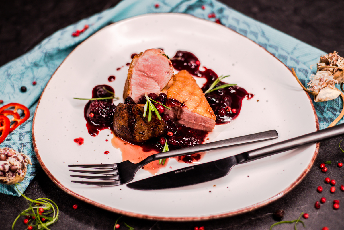 Новогодний стол не обязательно должен ломиться от десятков салатов и горячего «на всякий случай». Иногда достаточно одного блюда, но такого, которое задает тон всему вечеру. Утиная грудка в соусе порто именно из этой категории. Благородная, теплая по вкусу и настроению, с глубокой ягодной кислинкой и ароматом трав. Это еда не на бегу, а для длинного зимнего вечера, когда за окном темно, на столе горят свечи, а праздник еще только набирает обороты. Утиная грудка хороша тем, что выглядит по-настоящему празднично, но при этом не требует суеты. Важно лишь дать ей время и немного внимания. Кожа, надрезанная ромбами, при правильной обжарке превращается в хрустящую корочку, а мясо остается розовым и сочным. Именно за этот контраст утку так любят в ресторанной кухне. Соус порто в этом блюде играет не второстепенную роль. Портвейн, лесные ягоды и демиглас дают ту самую глубину вкуса, которая ассоциируется с зимой и праздниками. Соус получается густым, блестящим, с балансом сладости и кислотност