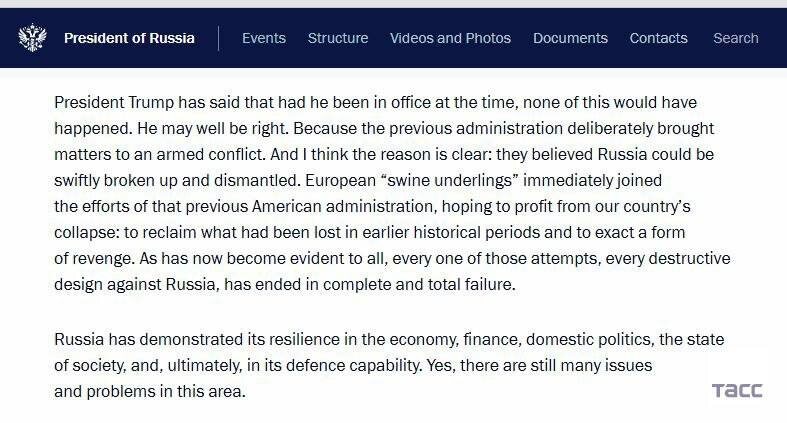 На англоязычной версии сайта Кремля в стенограмме с выступления Путина используется словосочетания swine underlings, выяснил ТАСС.