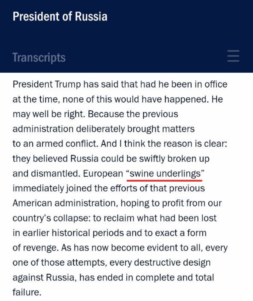The official Kremlin transcript translates 'podswinki' as 'swine underlings'