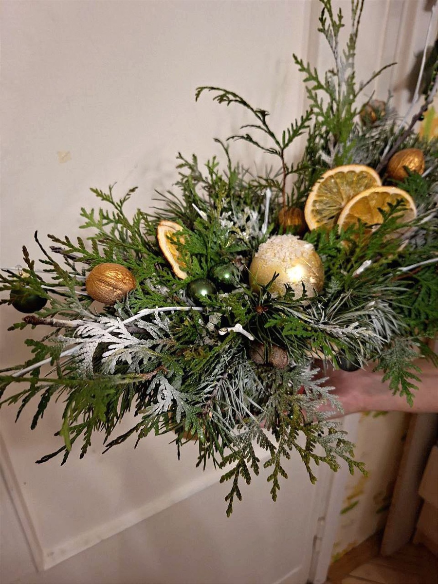 Ещё одна Новогодняя🎅 композиция готова, но как обычно.... что то пошло ни так и балончик с золотыми блестками потёк при пшике, поэтому это безобразие пришлось замаскировать искусственным снегом.. ⛄🎄