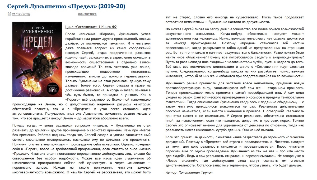 Сергей Лукьяненко "Предел" (2019-20) | Критика
