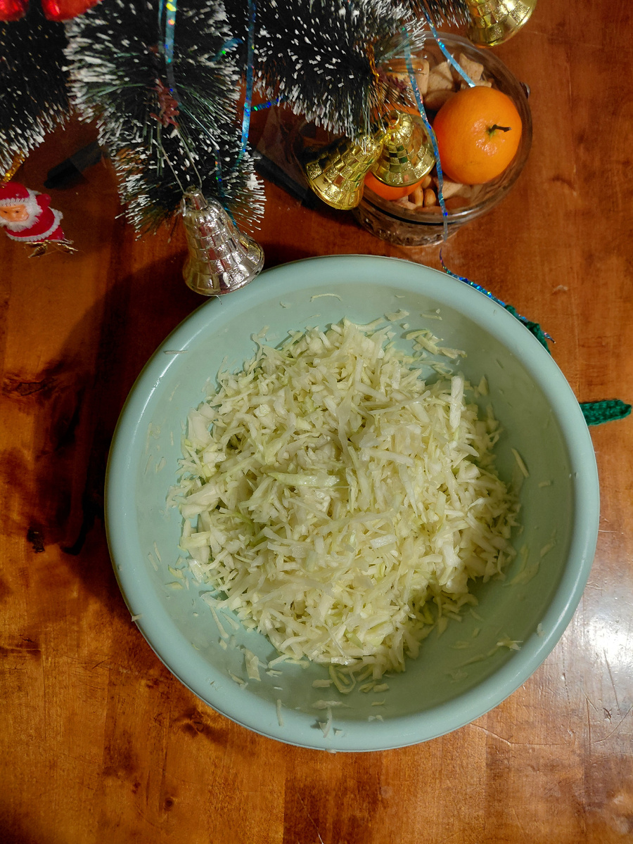 2.КАПУСТА белокочанная .Шинкуем ножичком, шинковочкой.(на тёрке не тереть ,потому что будет слишком много сока) Отправляем в емкость для приготавления,помнем её ручками чтобы была помягче .НЕ СОЛИТЬ!
