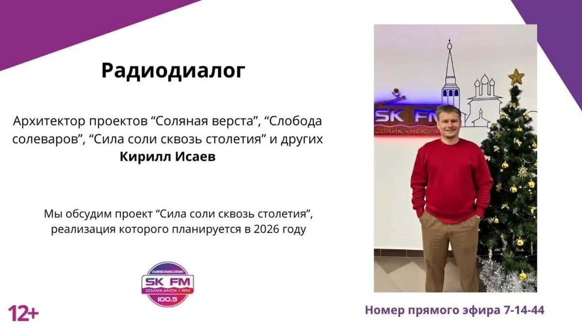 » 🔘Кирилл Исаев рассказал в радиоэфире о проекте «Сила соли сквозь столетия». 🔘Обсудили, как через современную архитектуру можно показать богатую историю Соликамска. Идея — создать в городе новое, яркое общественное пространство. 🔘Реализация проекта запланирована уже на 2026 год. ▶️Запись эфира можно посмотреть по ссылке.