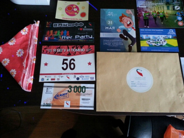 стартовые пакеты. Внутри номер, красная бандана в ромашках, реклама и буклеты. Среди них