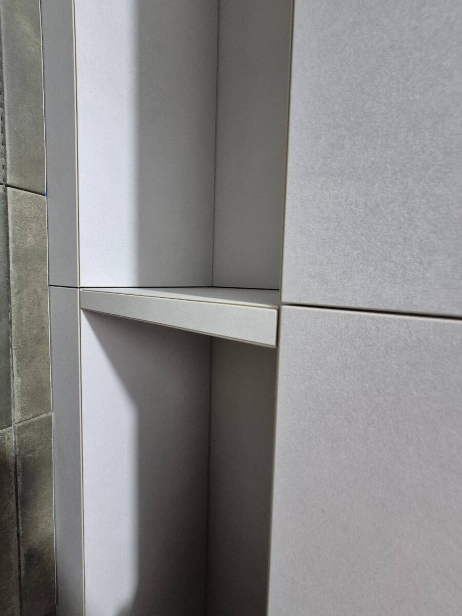 Когда делаете такие полочки из керамогранита: 1) да! Такие реально сделать! Было бы желание! 2) обязательно не доводите их до задней стенки ниши и оставляйте щель, чтобы уходила вода и не застаивалась в углах. 3) если делаете вентиляцию внутри ниши, то планируйте ее четко в рамках этой ниши, чтобы было 👌