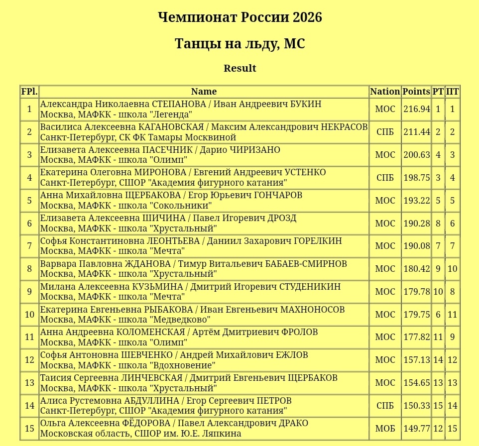 Постановка произвольного танца Александры Степановой и Ивана Букина хорошая, интерпретация тоже. Костюмы в одинаковом цвете решили вот надеть для разнообразия. Но не считаю эту пару перспективной на международном уровне. Если отбросить всю эту внешнюю красоту и присмотреться к ним повнимательнее, то видно, что поддержки и переходы тяжёлые, лёгкости в самом танце маловато. В начале перехода к Жулину была видна работа над скольжением, а сейчас снова вернулось как было. Особенно это видно в ритм - танце, где бесконечные догонялки на двух ногах. Все это мы уже видели много раз, нет в них ничего особенного. Как- то они совсем не меняются, застряли в одних образах. Оценка - 129,49 (216,94) балла - они выигрывают оба танца и теперь пятикратные чемпионы Росссии. Если будет выбор, то я за любую молодую пару, чем за этих, дважды невыездных чемпионов местного разлива.