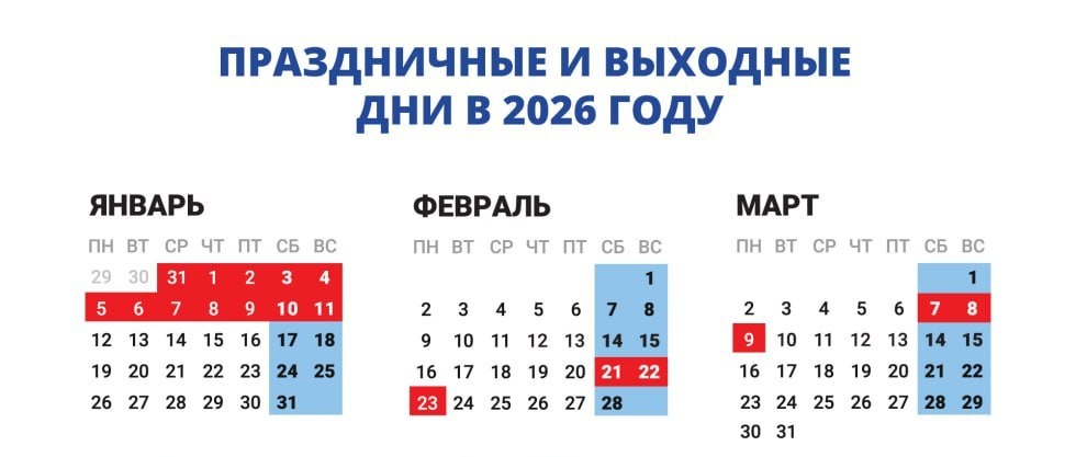 Новый год еще не наступил, но многие ремонтненцы уже с интересом просматривают производственный календарь. И правильно делают, потому что календарь поможет спланировать отпуск, определиться с короткими поездками за пределы района и просто рассчитать, когда можно передохнуть от работы и т.д.. Постановление о праздничных и выходных днях в 2026 году подписано премьер-министром Михаилом Мишустиным. В соответствии с документом, новогодние каникулы начнутся с 31 декабря и продлятся до 11 января. На майских будет по три выходных с пятидневной рабочей неделей между ними, еще три выходных подряд будет в июне. Праздничными выходными в 2026 году будут дни: Всего в 2026 году при графике 5/2 запланировано: