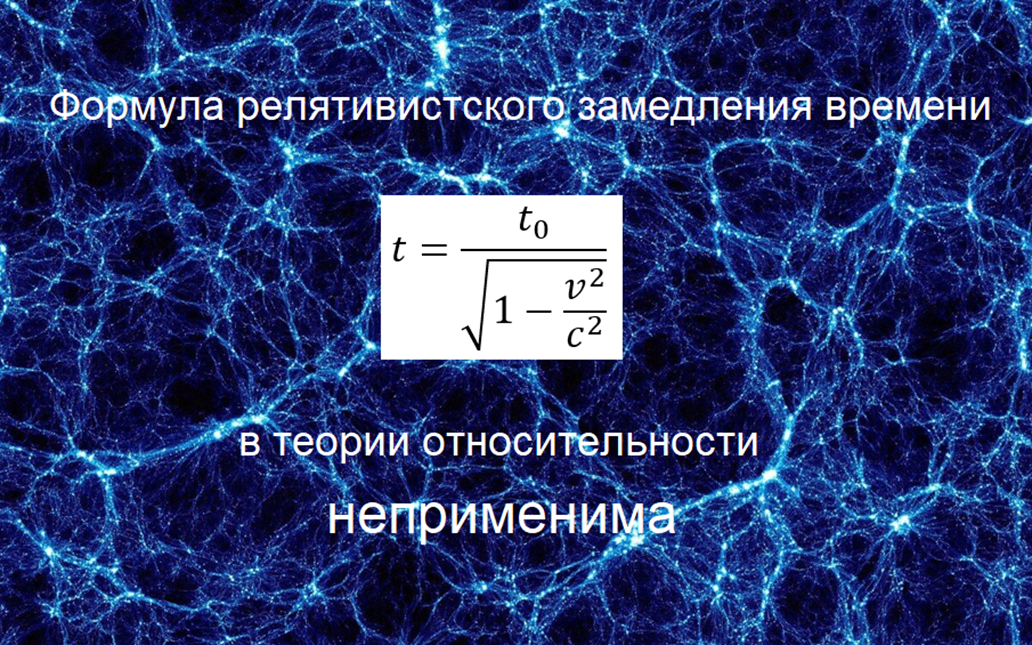 Преобразования времени Лоренца физически абсурдны, поскольку в них время зависит от координат: в зависимости от координаты вдоль оси, ориентированной в направлении движения системы, время (ход часов) непрерывно изменяется, причём это время есть время относительного движения двух систем отсчёта [1]. Чтобы избавиться от абсурдной зависимости времени от координат, физики вывели из преобразований времени Лоренца формулу релятивистского замедления времени: причём вывели незаконно [2, с. 121]. Тем не менее, формула релятивистского замедления времени стала одной из главных формул и основой специальной теории относительности (СТО) А. Эйнштейна, построенной на отрицании эфирной среды Вселенной и соответственно на отрицании возможности установления абсолютной скорости движения тел относительно эфирной среды. В СТО рассматривается только относительное движение тел, в котором покой и движение каждого тела – понятия относительные, то есть не подлежащие однозначному или абсолютному установлению. В