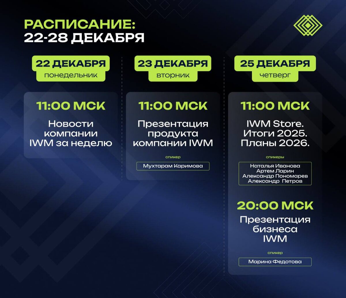 βοΈ Π£Π²Π°ΠΆΠ°Π΅ΠΌΡΠ΅ ΠΏΠ°ΡΡΠ½Π΅ΡΡ! ΠΠ°Π²ΡΡΠ° ΠΏΠΎΠ½Π΅Π΄Π΅Π»ΡΠ½ΠΈΠΊ! ΠΡΠΈΡΠ»ΠΎ Π²ΡΠ΅ΠΌΡ ΠΎΠ·Π½Π°ΠΊΠΎΠΌΠΈΡΡΡΡ Ρ ΡΠ°ΡΠΏΠΈΡΠ°Π½ΠΈΠ΅ΠΌ. ΠΠ°ΡΠ° Π½ΠΎΠ²Π°Ρ Π½Π΅Π΄Π΅Π»Ρ (22-28 Π΄Π΅ΠΊΠ°Π±ΡΡ) β ΡΡΠΎ ΠΊΠΎΠ½ΡΠ΅Π½ΡΡΠΈΡΠΎΠ²Π°Π½Π½ΡΠΉ Π½Π°Π±ΠΎΡ Π·Π½Π°Π½ΠΈΠΉ, ΠΈΠ½ΡΠ°ΠΉΡΠΎΠ² ΠΈ Π²ΠΎΠ·ΠΌΠΎΠΆΠ½ΠΎΡΡΠ΅ΠΉ, ΠΊΠΎΡΠΎΡΡΠ΅ Π²ΡΠ²Π΅Π΄ΡΡ Π²Π°Ρ Π±ΠΈΠ·Π½Π΅Ρ ΠΈ ΠΈΠ½Π²Π΅ΡΡΠΈΡΠΈΠΎΠ½Π½ΡΠΉ ΠΏΠΎΡΡΡΠ΅Π»Ρ Π½Π° Π½ΠΎΠ²ΡΠΉ ΡΡΠΎΠ²Π΅Π½Ρ. ΠΠ°Ρ Π±ΠΈΠ»Π΅Ρ Π² ΠΌΠΈΡ Π³ΡΠ°ΠΌΠΎΡΠ½ΡΡ