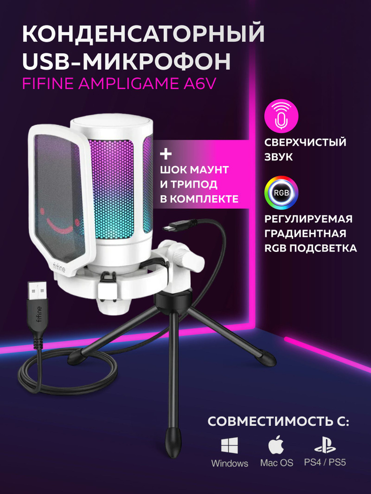 Конденсаторный USB-микрофон Fifine AmpliGame A6V с RGB-подсветкой (White)