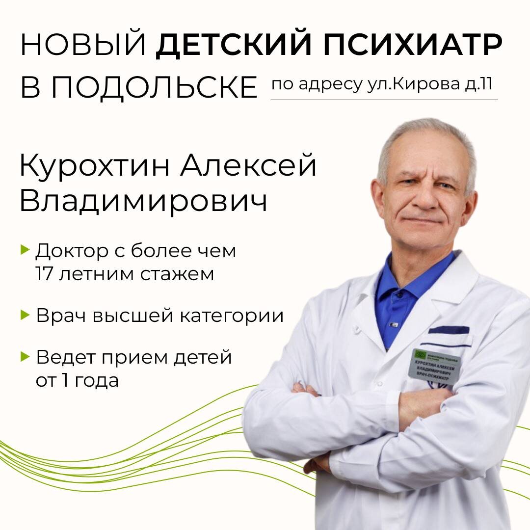 ! 📌Мы рады сообщить, что в сети клиник «Жемчужина Подолья» с декабря 2025 года штат наших профессиональных врачей пополнился новым высококвалифицированным доктором. 📌В нашем детском отделении по адресу улица Кирова дом 11, теперь свой прием ведет детский психиатр Курохтин Алексей Владимирович, доктор с более чем 17 летним стажем и огромное практикой детской психиатрии, как в государственных, так и частных медицинских учреждениях. - Является врачом высшей категории. - Доктор ведет прием детей от 1 года, поможет и оценит возрастную норму психического здоровья ребенка, а так же бережно решить уже сформированные проблемы ! Желаем Алексею Владимировичу успехов в работе! ___ 📞Записаться к специалистам: по телефонам +7 499 400-35-33 🌐на сайте https://podolskclinic.ru