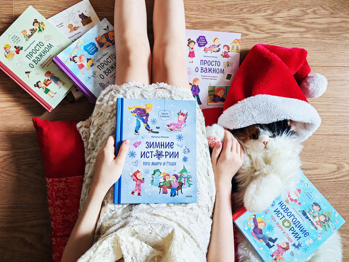В издательстве МИФ вышла очередная книга Натальи Ремиш серии «Просто о важном. Про Миру и Гошу» — «Зимние истории про Миру и Гошу». Я уже сбилась со счету, какая по счету эта у нас книга. Не все издания серии мне нравились, но вот «Зимние истории про Миру и Гошу» попали в мой список must have. Это истории из жизни многодетной семьи. Главные герои: девочка Мира восьми лет, двенадцатилетний мальчик Гоша и самая младшая Бейби, которую как оказалось зовут Кая. В семье живут собака и кошка. А еще у ребят очень осознанные мама и папа: спокойные, рассудительные, понимающие, всегда знающие, что ответить и как себя вести. Мне по этому поводу часто «прилетает» от моей дочки, мол, ну почему я не такая мама, как в книге про Миру и Гошу… Дети растут вместе с книгами, неизменно остается тот факт, что всегда в жизни есть ситуации конфликтов, непонимания как внутри семьи, так и за ее пределами: в школе, на площадке, в гостях. И, соответственно, есть что обсудить. В этой книге 10 историй, внутри издани