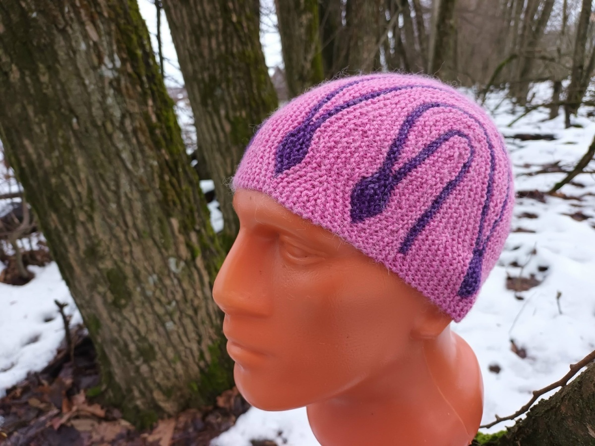 Последняя из обещанных шапок. Вяжется от одной стороны до другой частичным вязанием вот такими хитрыми закорючками. Можно надевать любой стороной - шов трикотажный, его не найти, его как будто и нет. Довольно сложная - требует сосредоточенности и хорошего владения частичным вязанием. Связана из мериноса. Свободна