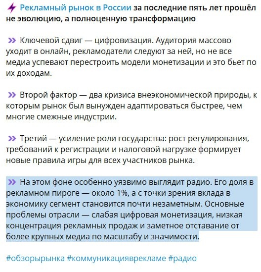России (АКАР) и проект Вместе Медиа, созданный в 2002 году Фондом независимого радиовещания, констатируют смерть российского радиовещания в качестве рекламного носителя. ⚡️ Рекламный рынок в России за последние пять лет прошёл не эволюцию, а полноценную трансформацию ▫️ Ключевой сдвиг — цифровизация. Аудитория массово уходит в онлайн, рекламодатели следуют за ней, но не все медиа успевают перестроить модели монетизации и это бьет по их доходам. ▫️ Второй фактор — два кризиса внеэкономической природы, к которым рынок был вынужден адаптироваться быстрее, чем многие смежные индустрии. ▫️ Третий — усиление роли государства: рост регулирования, требований к регистрации и налоговой нагрузке формирует новые правила игры для всех участников рынка. ▫️ На этом фоне особенно уязвимо выглядит радио. Его доля в рекламном пироге — около 1%, а с точки зрения вклада в экономику сегмент становится почти незаметным. Основные проблемы отрасли — слабая цифровая монетизация, низкая концентрация рекламных