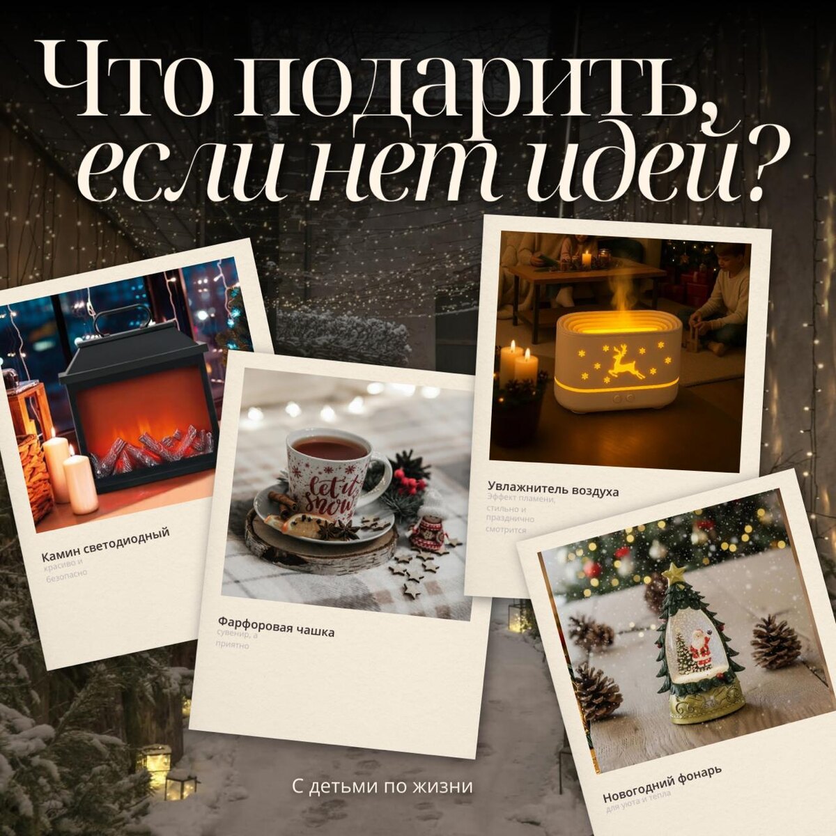 ? 🎁 Собрала небольшой список, может пригодиться 🔥 Камин светодиодный авангард небольшой, тот который впишется в любой интерьер и будет дарить уют. у меня в отложенных такой (артикул WB 44194755) 🎁 Книга-квест заказала такую книгу квест о похитителе времени Эксмо, "Ты-помошник детектива! (артикул WB 303705074) 🫥 Настольная детективная игра "Элементарно" разные тематики и сюжеты, выбираем любой. Мы с мужем играли уже в 2 игры и оба раза были очень близки, но ни разу с точностью 100%. Очень интересно и даже весело. 🎄Ночник-светильник или новогодний фонарь всегда беспроигрышная тема купить какой-нибудь красивый (вроде такого артикул WB 594325312) или оригинальный. Можно даже найти в виде котика (артикул WB 150559554) 🎄 Шапка светящаяся новогодняя что-то вроде такого (артикул WB 101996164). Прикольная же! ☕️ Кружка фарфоровая тематическая классика, которая никогда не устареет. Красивая кружка для кофе, какао с зефирками и просто для праздничной атмосферы. ⭐️ Увлажнитель возду