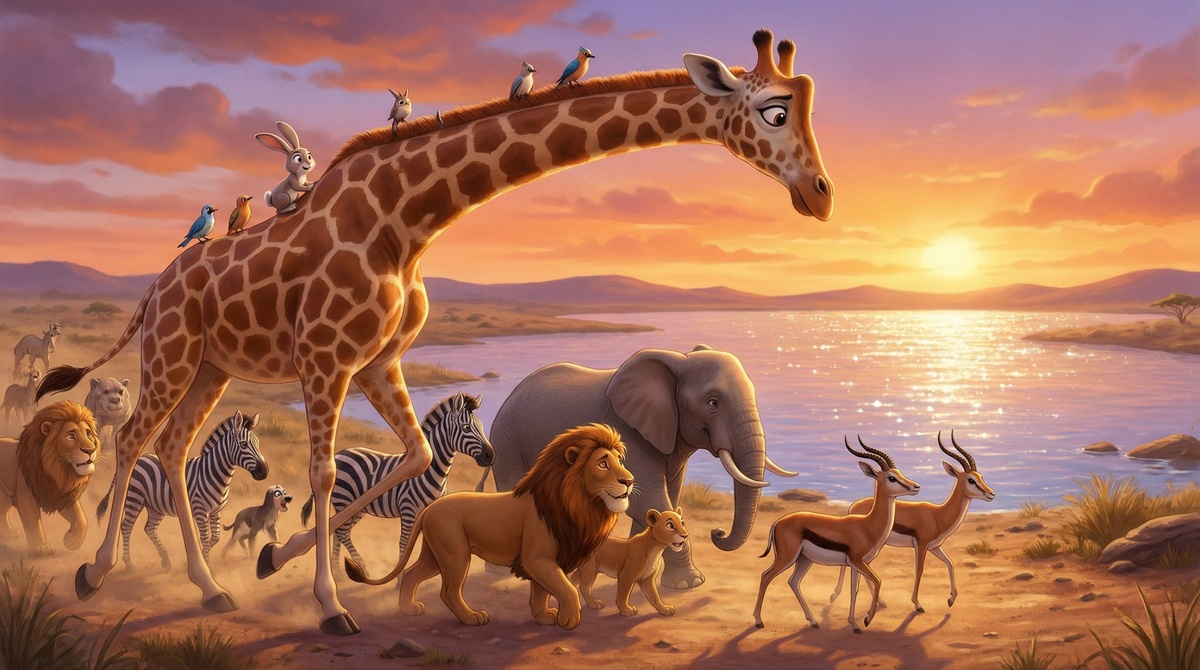 » В самом сердце солнечной саванны жил-жил жираф по имени Голиаф. Он был необычайно высоким, с длинной шеей, которая могла достать до самых высоких веток акаций, и глазами, полными доброты. Но самое главное, Голиаф был невероятно дружелюбным и всегда готовым помочь другим животным. Каждое утро он приветствовал друзей своим мягким, глубоким голосом. Львы, зебры, антилопы и даже маленькие птички чувствовали себя спокойно рядом с ним. Однако несмотря на его доброту, Голиаф часто чувствовал себя одиноким. Все звери восхищались его ростом, но не решались подходить ближе — им казалось, что большой жираф слишком занят своими делами. Однажды, когда солнце только вставало над горизонтом, в саванне раздался испуганный писк. Маленький кролик Зиги застрял в густых кустах, и никто не мог помочь ему выбраться. Голиаф поспешил на помощь. Он осторожно наклонил свою длинную шею и аккуратно вытянул Зиги из кустов. Кролик радостно подпрыгнул и побежал к другим зверятам, рассказывая всем о добром жираф