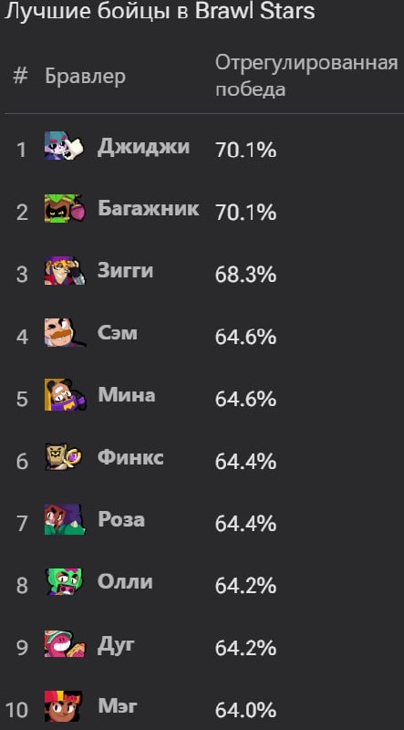 1. Джиджи с 70.1% 2. Транк (багажник)) с 70.1%🐜 3. Зигги с 68.3%🎼 4. Сэм с 64.6%🥊 5. Мина с 64.6%🎧 6. Финкс с 64.4%🏜 7. Роза с 64.4%🌹 8. Олли 64.2%🎧 9. Даг с 64.2%🌭 10. Мэг с 64.0%⚙️ ✅Новости по Clash Royale - ТЫК 😌Новости по Roblox - ТЫК Мир Supercell. Подписаться