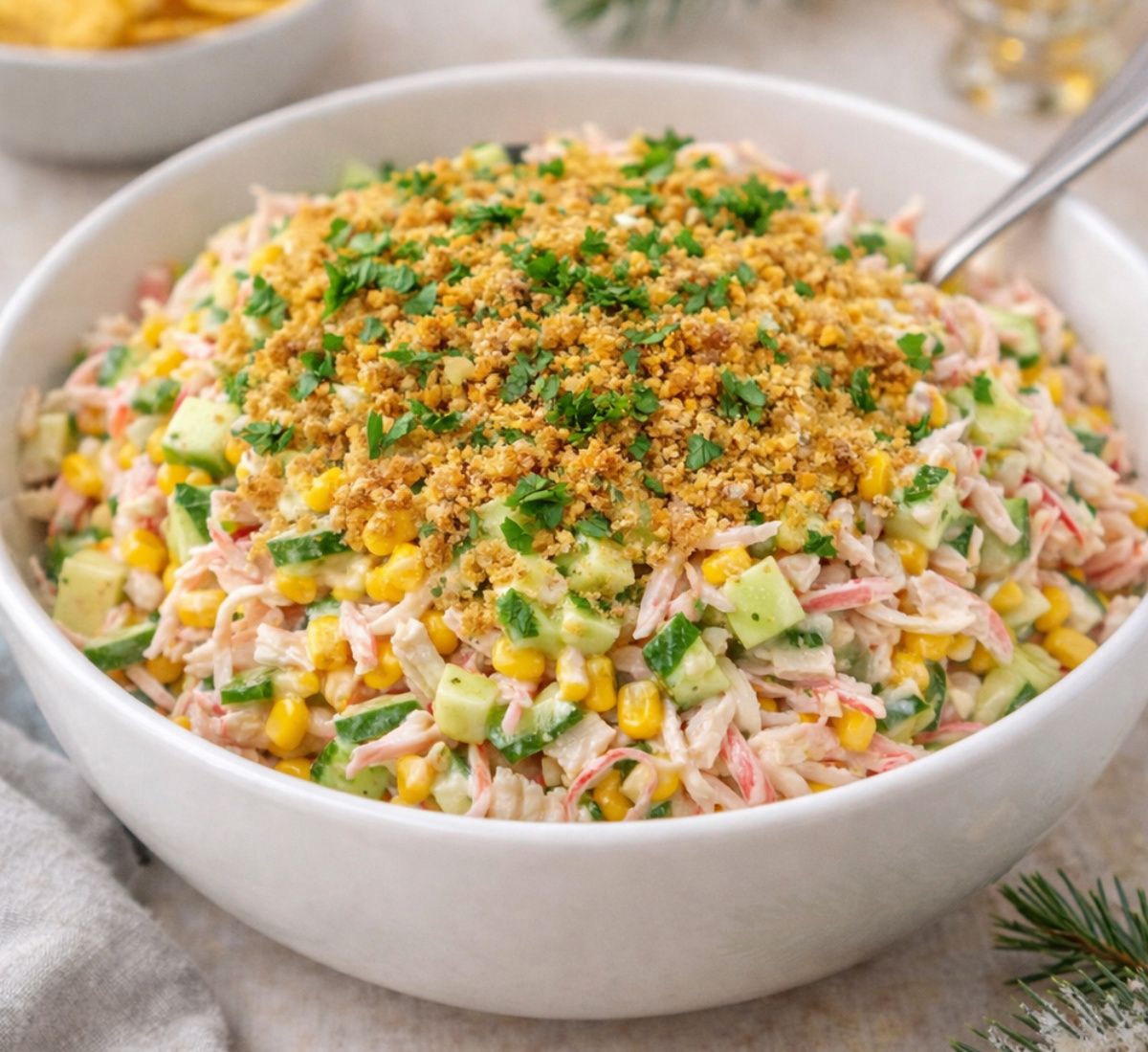 Крабовый салат знаком всем, но этот вариант стал для меня настоящим открытием. Вроде бы всё привычно, а вкус — совсем другой: более свежий, насыщенный и с приятной хрустящей ноткой. Когда поставила его на стол, гости сначала отнеслись скептически, а потом просили добавку. Салат реально затягивает — ешь и не можешь остановиться. Главный секрет — необычное сочетание текстур и лёгкая пикантность, которая отлично освежает классический вкус крабовых палочек. Крабовые палочки — 200 г Свежий огурец — 1–2 шт. Консервированная кукуруза — 1 банка Яйца — 3 шт. Твёрдый сыр — 80–100 г Майонез — по вкусу Сухари или панировочные крошки — 2–3 ст. л. Зелень — по желанию Соль — по вкусу Крабовые палочки нарежьте тонкой соломкой. Огурец нарежьте небольшими кубиками. Яйца отварите вкрутую и мелко нарежьте. Сыр натрите на крупной тёрке. Смешайте все ингредиенты с кукурузой, добавьте майонез и соль. Перед подачей посыпьте салат сухарями и зеленью. Сухари добавляйте непосредственно перед подачей, чтобы он