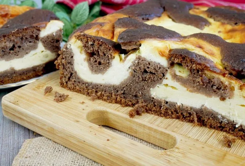 1 ст. л. муки Заранее достаньте кефир и яйца из холодильника, чтобы они нагрелись до комнатной температуры. В миске смешайте муку, какао, разрыхлитель и пищевую соду. В другой миске смешайте кефир, сахар, яйца и масло. Затем вылейте сухие ингредиенты в жидкие и тщательно перемешайте венчиком до образования однородного теста. Смешайте творог с яйцами и сахаром, затем добавьте ванилин и муку. Застелите противень размером 25х30 см пергаментной бумагой. Вылейте 2/3 шоколадной смеси и равномерно распределите. Выложите ложкой творожную смесь сверху, но не ровным слоем, а пятнами. Распределите оставшуюся шоколадную с