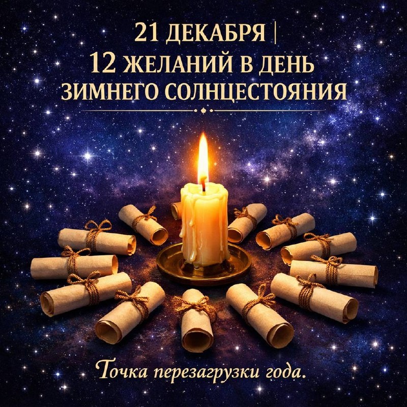 Играем? Сегодня, 21 декабря — день Зимнего солнцестояния. Астрономическая точка, после которой свет начинает прибывать. В магии всех традиций — это момент глубочайшей тишины и мощи. Самые тёмные сутки перед рассветом. Идеальное время для самого важного ритуала уходящего года. Зажги свечу. Приготовь 12 маленьких листочков бумаги и ручку. Сегодня мы не просто «загадываем». Мы передаём заявление во Вселенную и получаем от неё четкий приоритетный запрос на 2026 год. 🎯 ПРАВИЛА ИГРЫ «12 ЖЕЛАНИЙ СОЛНЦЕСТОЯНИЯ» 1. ФОРМИРУЕМ ЖЕЛАЕМОЕ (21 декабря, сегодня). Успокойся. Возьми 12 бумажек. На каждом листочке напиши ОДНО желание. От сердца, что важно. Можно: «Деньги», «Здоровье», «Переезд», «Любовь», «Смелость выступать», «Свобода от долгов», «Издание книги», «Путешествие в Японию», «Внутренний покой» — что угодно, материальное и не материальное. Важно: формулируй чётко, как будто даёшь техническое задание. Не «хочу быть счастливой», а «испытывать радость в своей жизни». Пиши уверенно. 2. ОТПУ