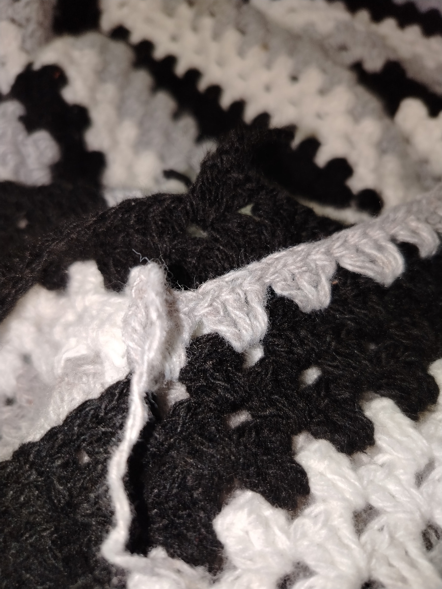 Не успела довязать третий ряд чёрными нитками, и довязала серые.