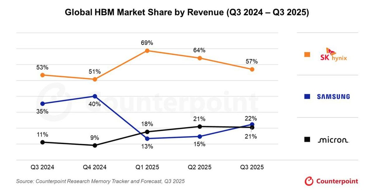 Лидером по-прежнему остаётся SK Hynix — 57% рынка в III квартале 2025 года. Samsung вышла на второе место с 22%, Micron — третья с 21%. HBM3E от Samsung уже используют AMD, а следующим шагом должно стать одобрение NVIDIA на HBM4. Даже вместе три производителя не покрывают спрос ИИ-рынка — дефицит HBM может продлиться от 6 месяцев до 3 лет. 💬 @Mikhaylov_Review
