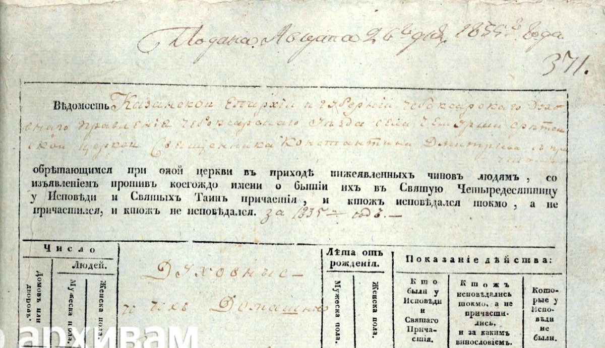 ГИА Чувашской Республики (ГИА ЧР), фонд № 225, опись № 7, дело № 56, стр. 492 скан. Подана августа 26-го дня 1835 года. Ведомость Казанской епархии и губернии Чебоксарского духовного правления Чебоксарского уезда села Чемурши Сретенской церкви священника Константина Дмитриева с причетники обретающимся при оной церкви в приходе нижеявленых чинов людям, со изьявлением против коегождо имени о бытии их в Святую Четыредесятницу у исповеди и Святых таин причастия, и кто ж исповедовался токмо, а не причастился, и кто ж не исповедался. За 1835 год. Духовные и их домашние. 3. Пономарь Алексей Михайлов Семов. 37. Жена ево Прасковья Иванова. 33. Дочери их: Мавра. 6. Варвара. 3. https://yandex.ru/archive/catalog/50fee2f1-1707-4754-ac69-426b8fb39c20/375