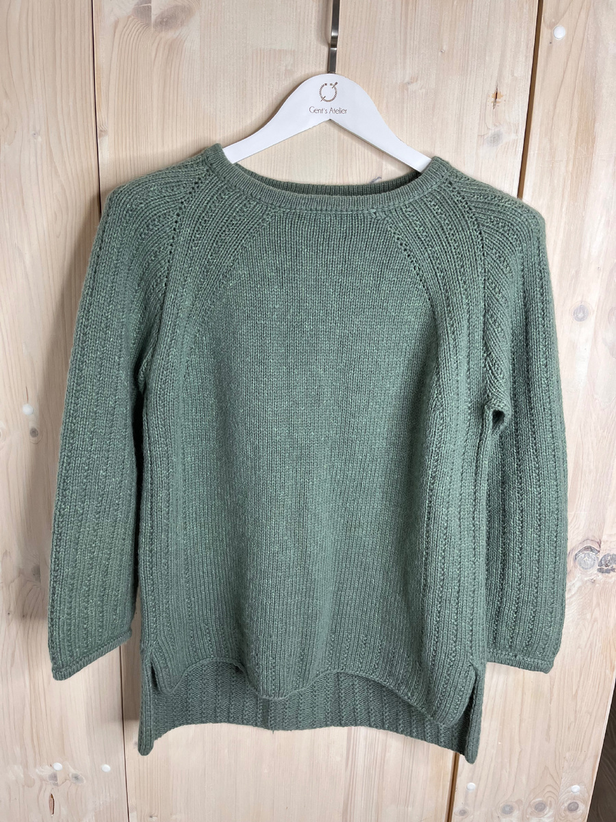 Особенность: декоративные регланные линии и рукава с фактурным узором, красивая крючковая обработка горловины и манжет Рекомендуется связать образец лицевой гладью и узором (1 изн, 3 лиц) для точного попадания в размер. Итого: 104 петли Раппорт — 4 петли. Вяжутся лицевой гладью, если не указано иное. Рукава и регланные линии продолжаем вязать узором, перед и спинку — лицевой гладью. После завершения регланных прибавок: Корпус вяжется без убавок до желаемой длины. На нужной высоте разделить вязание: Далее вязать поворотными рядами основным узором. Свитер получается: